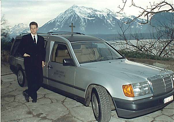 Andreas Schwarz in jungen Jahren mit Bestattungsfahrzeug
